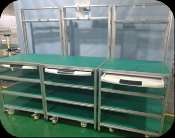 इनमें प्रकाश व्यवस्था (जैसे, फ्लोरोसेंट ट्यूब, स्वतंत्र स्विच, पावर स्ट्रिप्स, वायरिंग); लॉजिस्टिक सिस्टम (जैसे, कन्वेयर बेल्ट, स्लाइडिंग रेल, टर्नटेबल, रोबोटिक आर्म); साथ ही दराज, इलेक्ट्रिक स्क्रूड्राइवर स्लॉट, प्रक्रिया प्रवाह गाइड और चेतावनी रोशनी शामिल हैं।